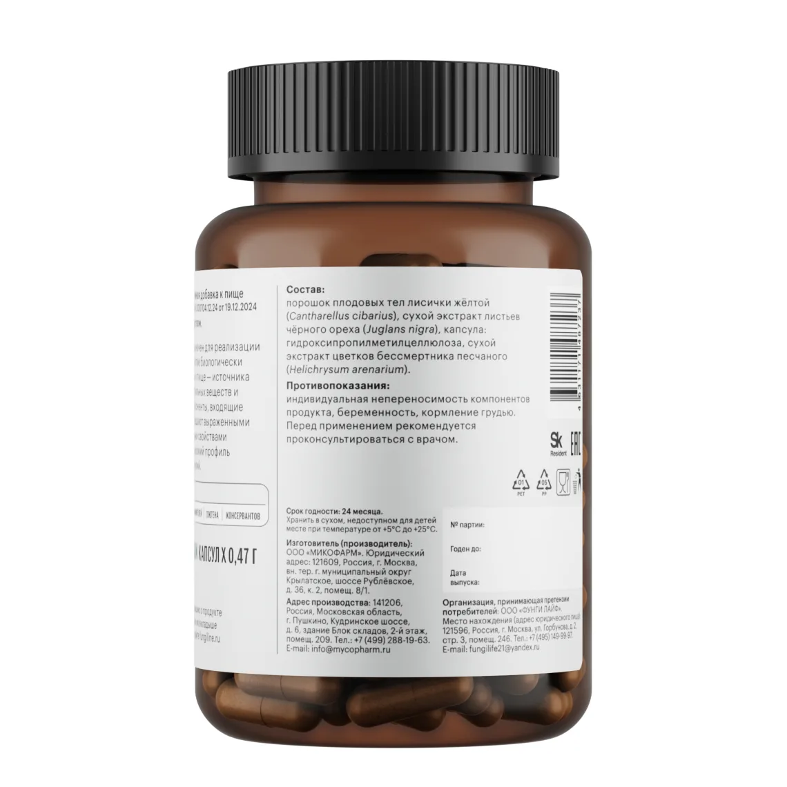 Юглон черного ореха и полисахариды лисички провоцируют гибель паразитов и выводят их из организма вместе с продуктами жизнедеятельности, снижая интоксикацию и воспаление.